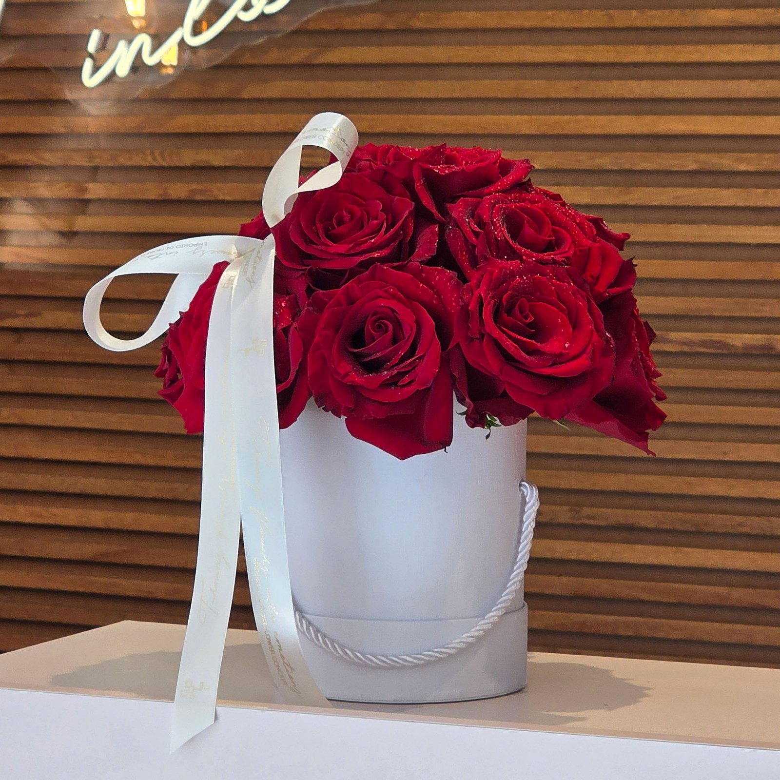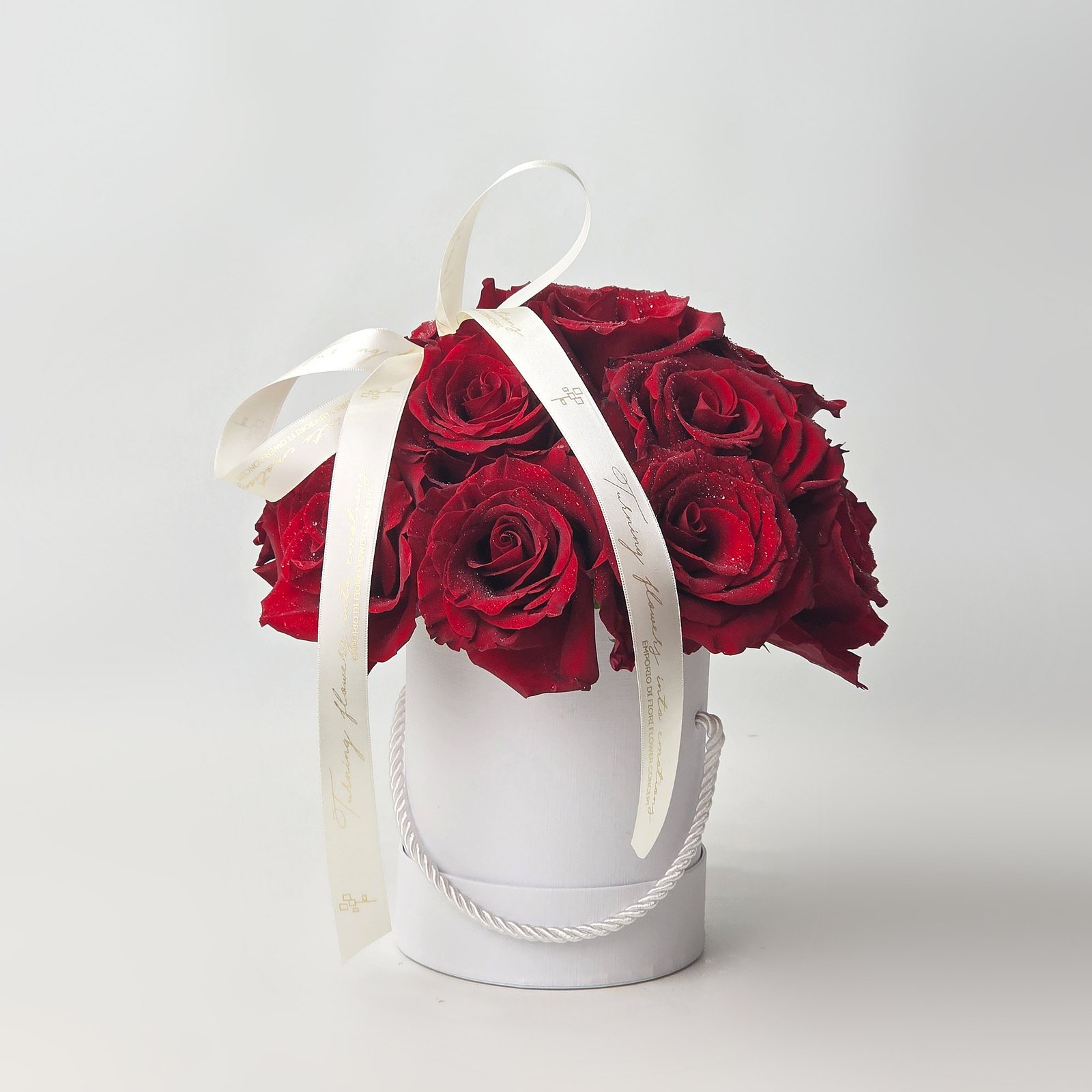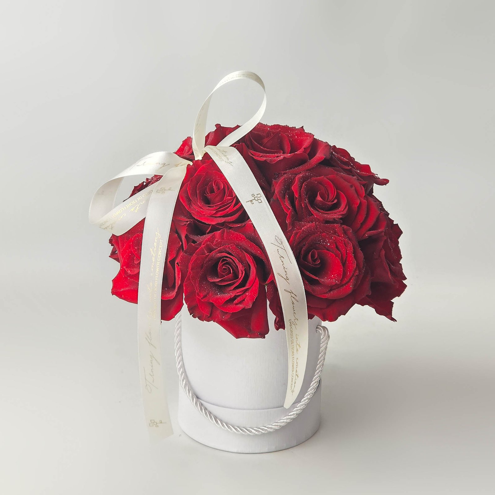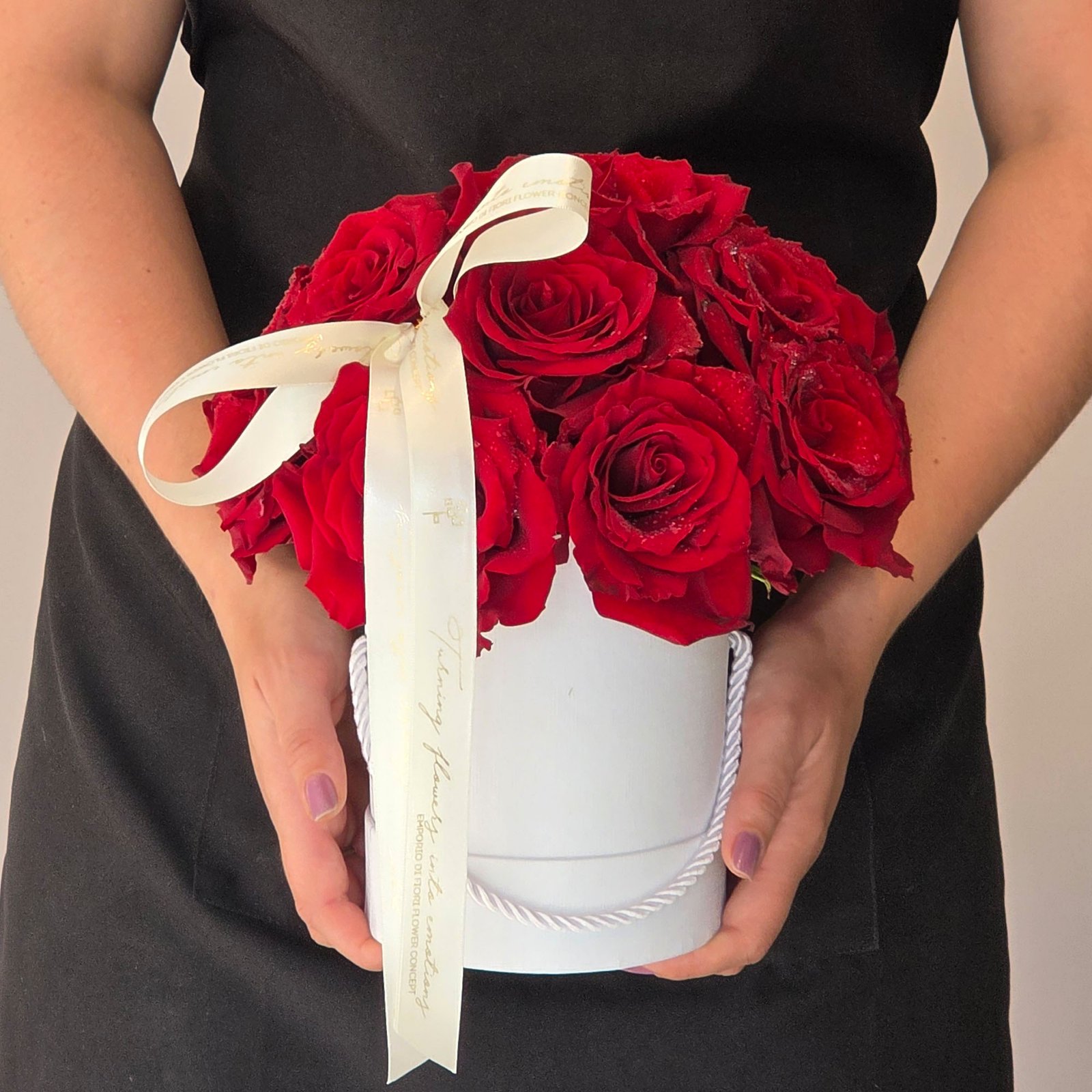 As rosas são dispostas de forma harmoniosa em uma elegante box branca de papel rigido com revestimento em courino, finalizada com laço delicado, criando um presente atemporal que transmite sentimentos profundos e inesquecíveis.