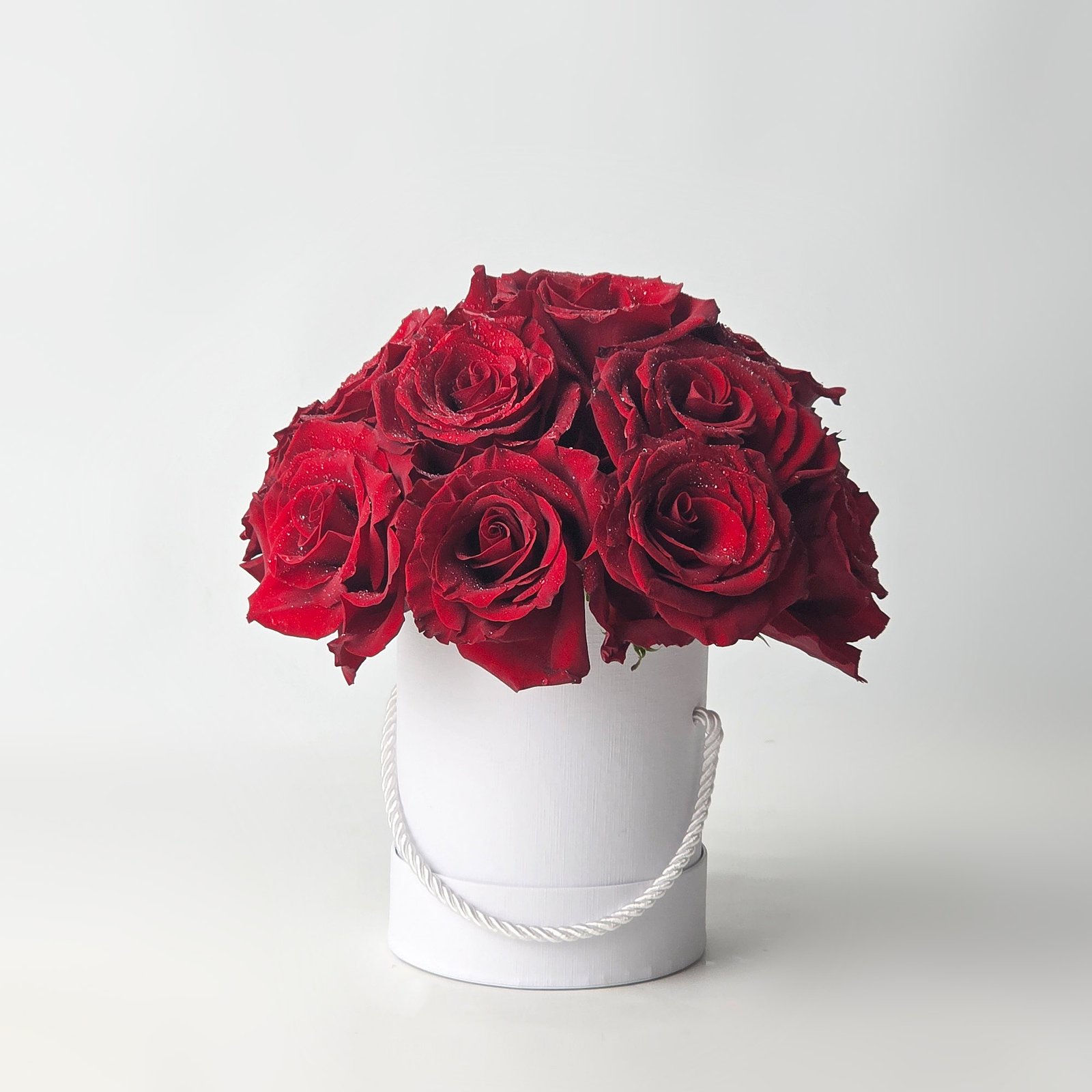 15 rosas importadas vermelhas frescas, acomodadas em box elegante com acabamento premium.