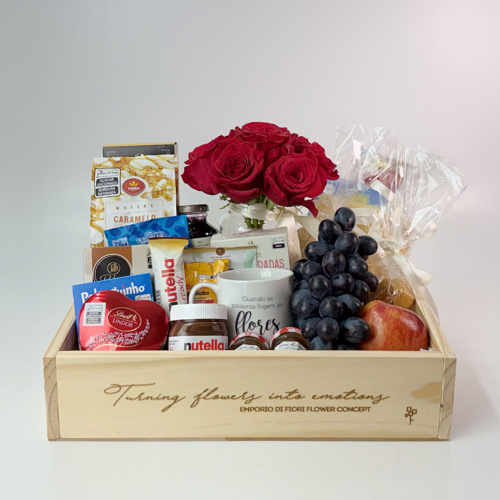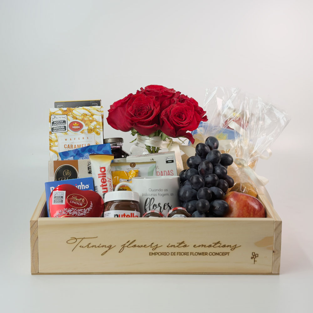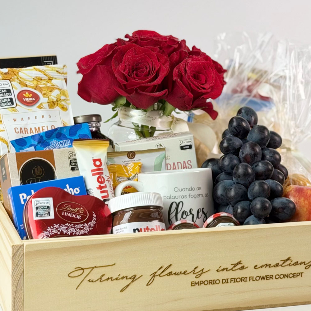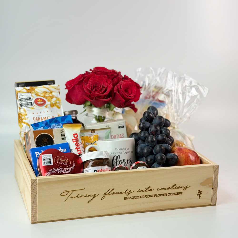 A Cesta Lovely, criada pela Emporio Di Fiori, é o presente perfeito para momentos especiais. Com um design sofisticado e itens selecionados, esta cesta combina o melhor da gastronomia com a delicadeza das flores. Dentro da elegante caixa de madeira personalizada, você encontrará: