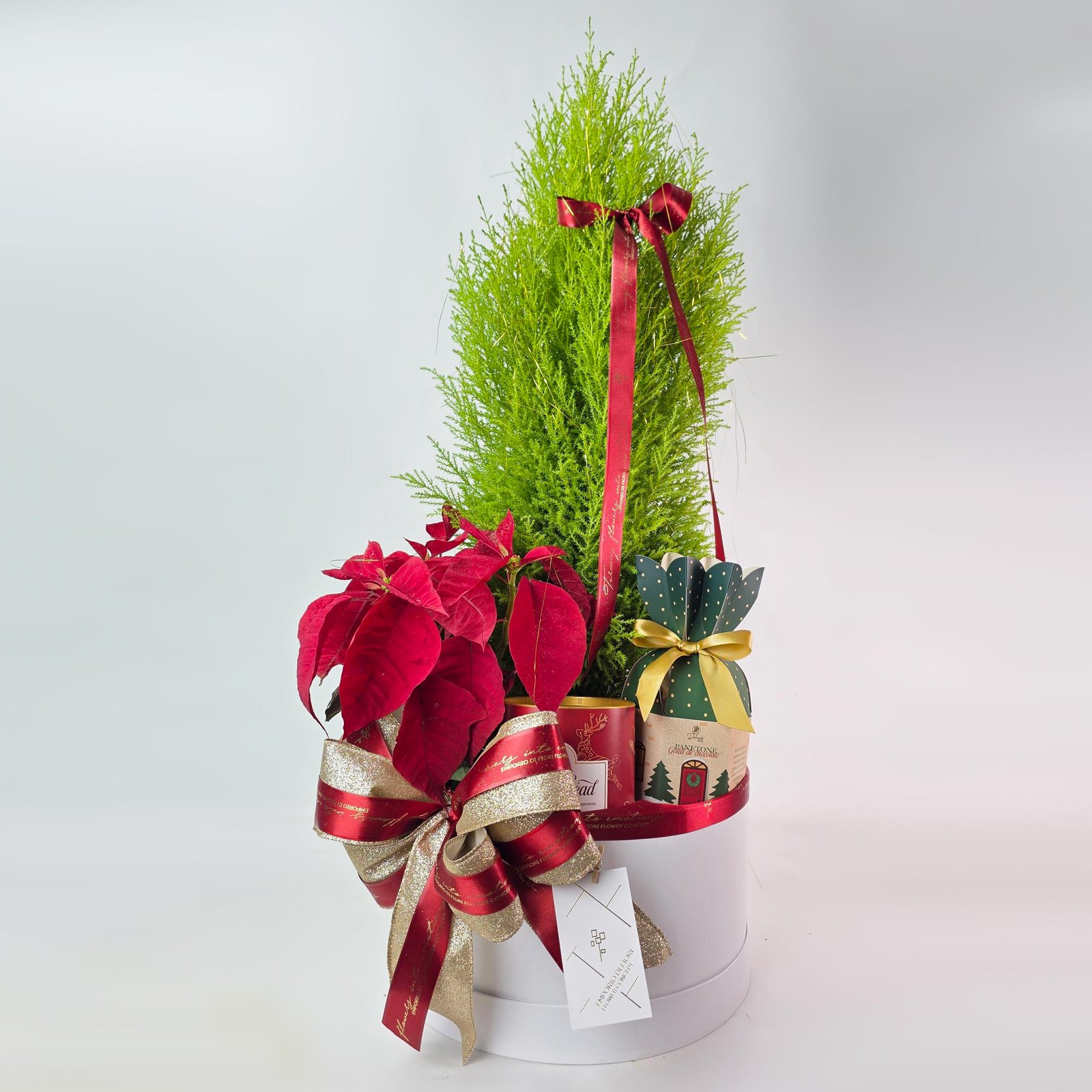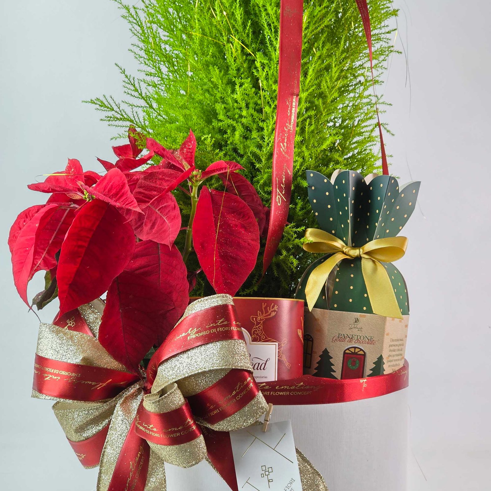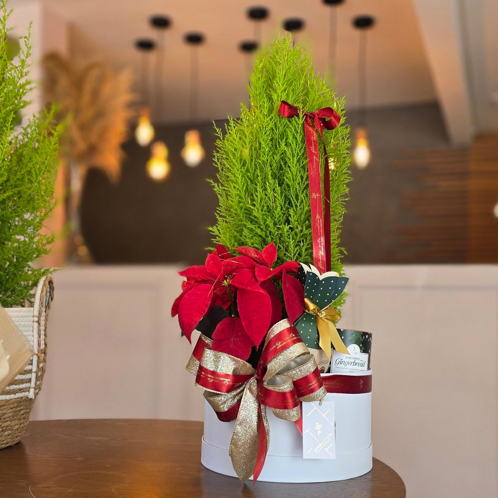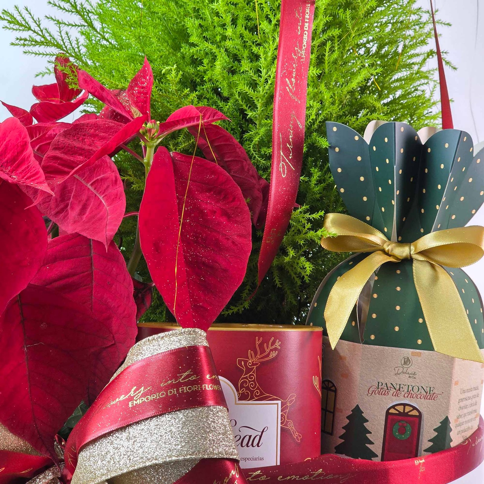 Cada detalhe é pensado para encantar: o verde vibrante do cipreste, o vermelho intenso da flor natalina e os toques dourados que completam a harmonia da composição. Tudo embalado com o padrão premium da Emporio Di Fiori.
