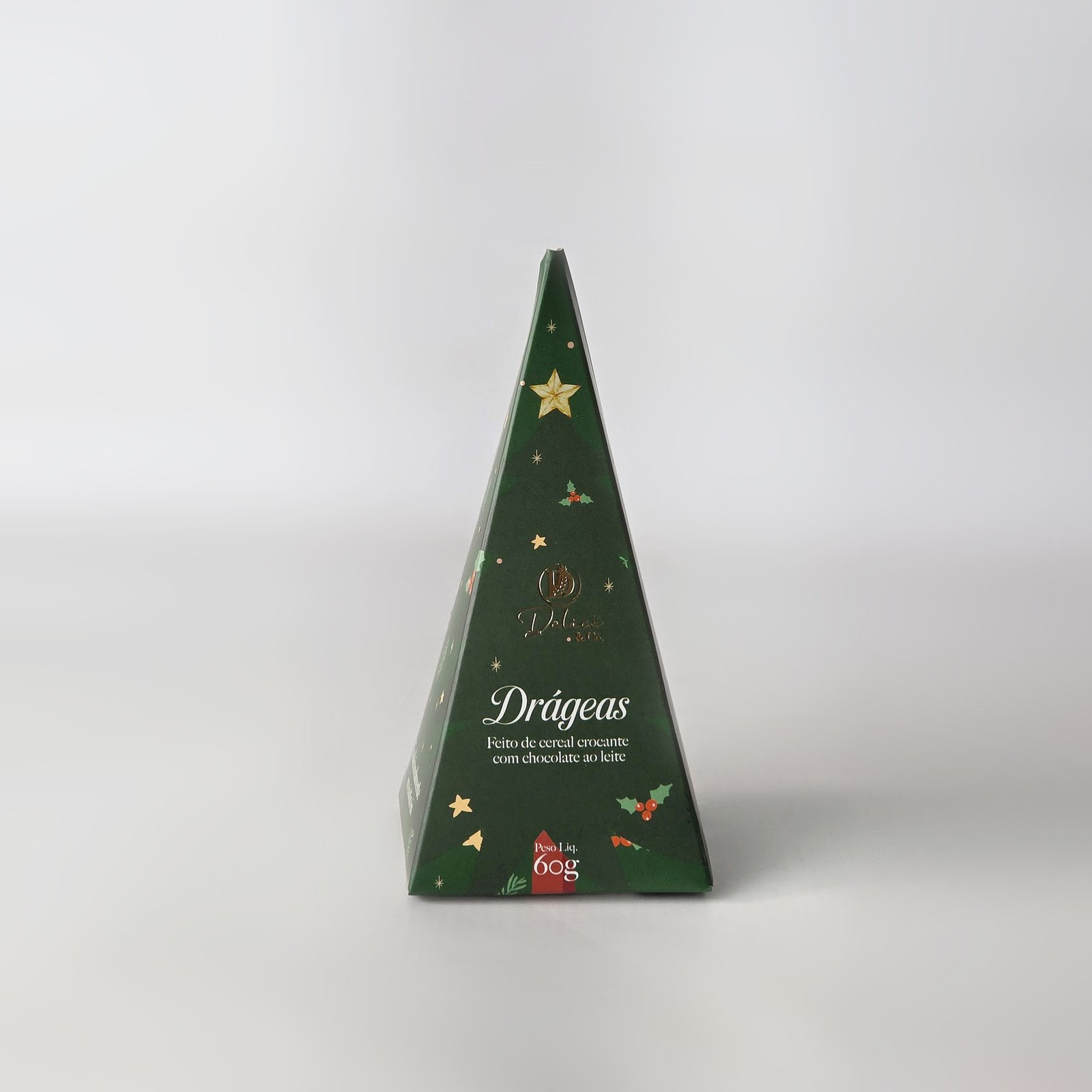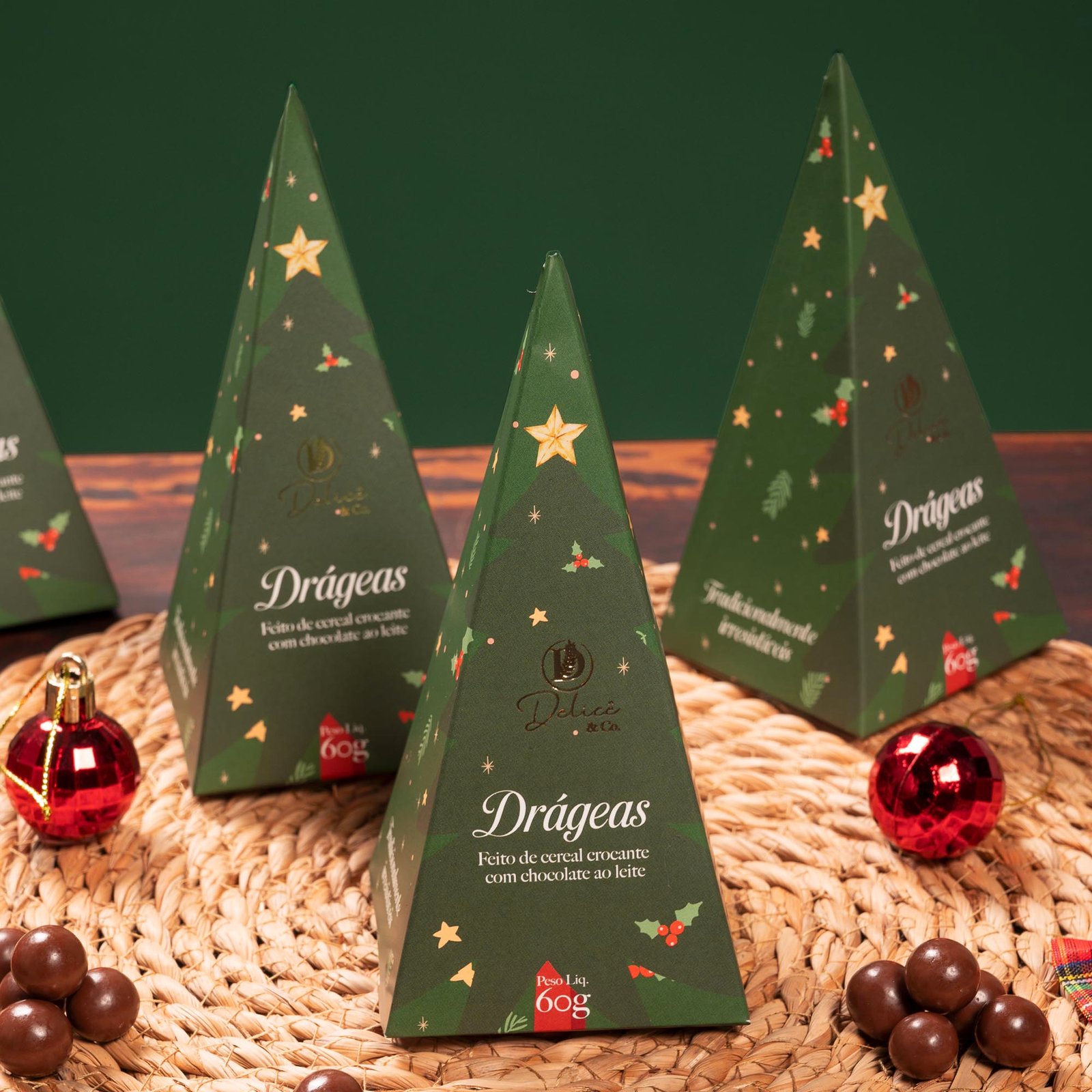 As Drágeas Delice & Co combinam o irresistível sabor do chocolate ao leite com o leve toque crocante do cereal, criando uma experiência deliciosa e sofisticada. A embalagem em formato de árvore de Natal transforma o produto em um presente encantador — ideal para compor cestas, decorar mesas festivas ou surpreender com um mimo elegante.