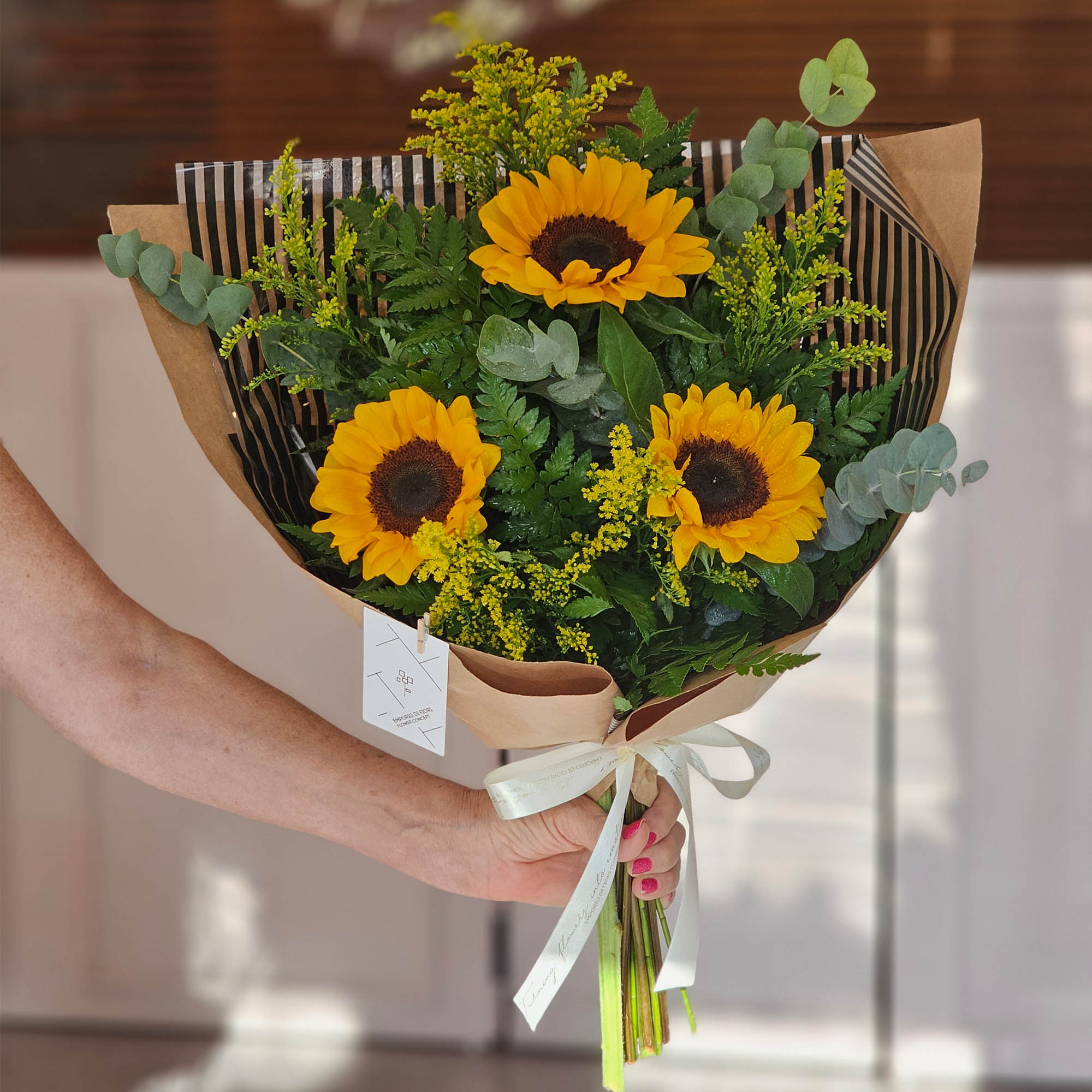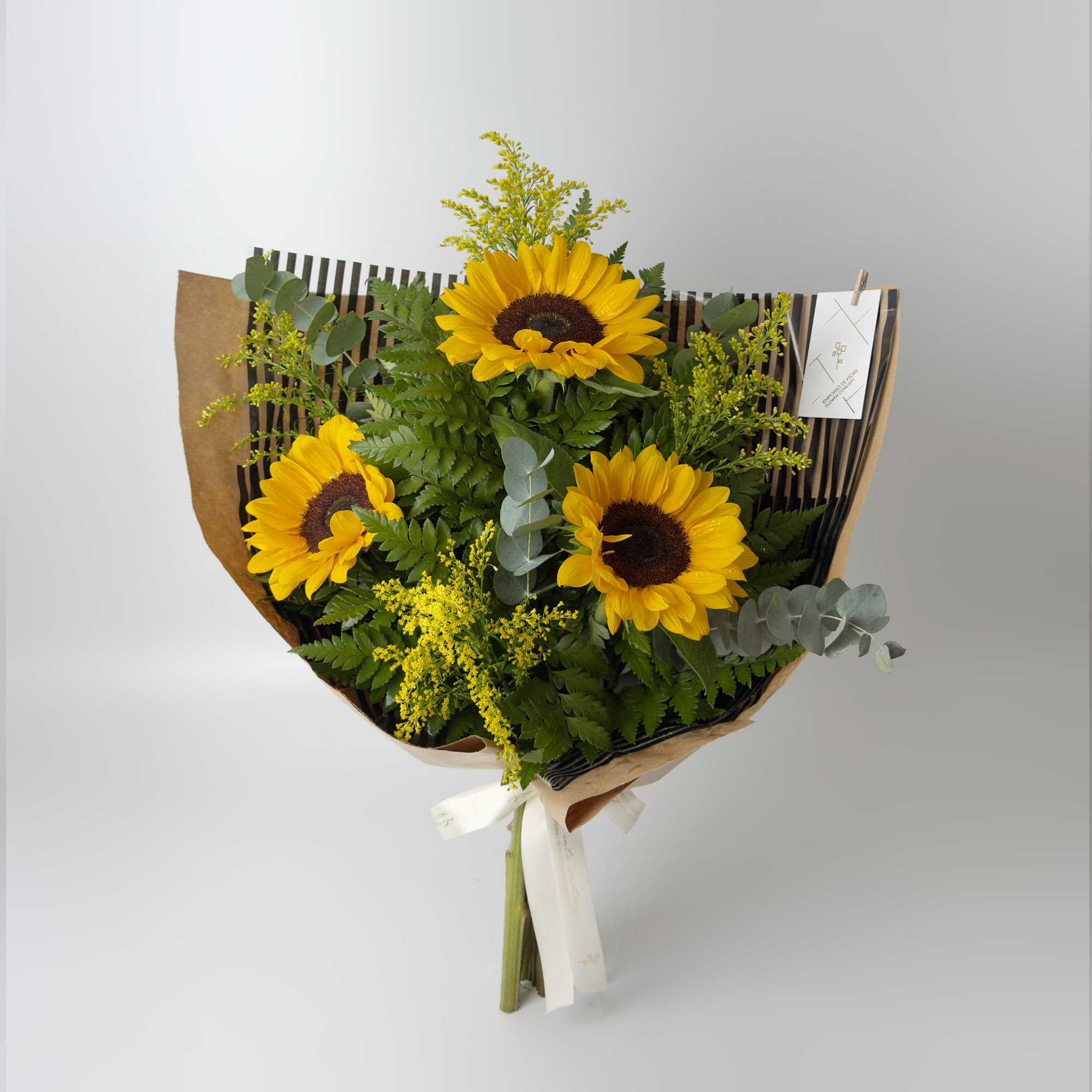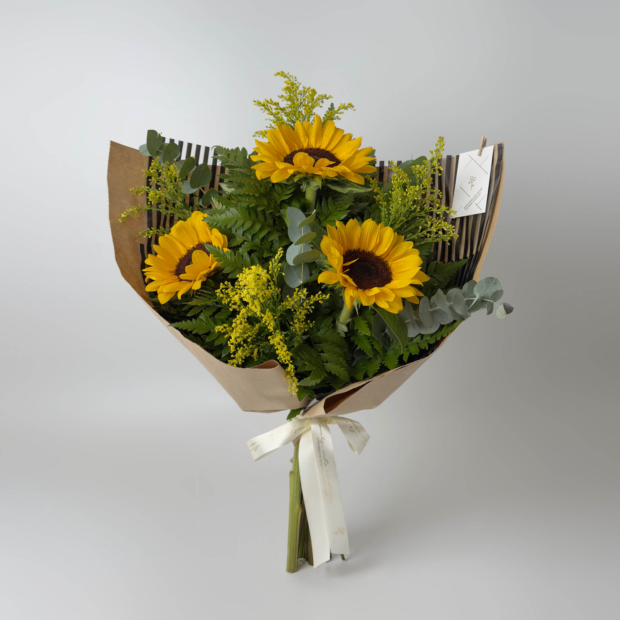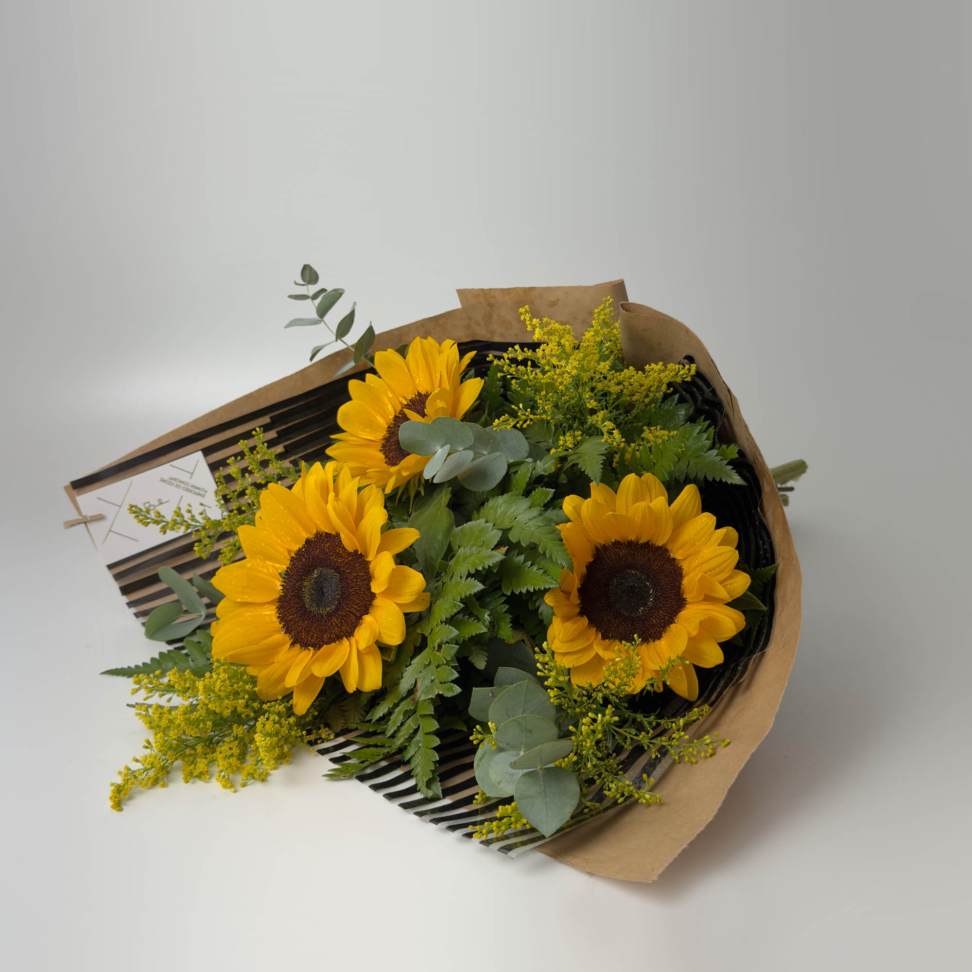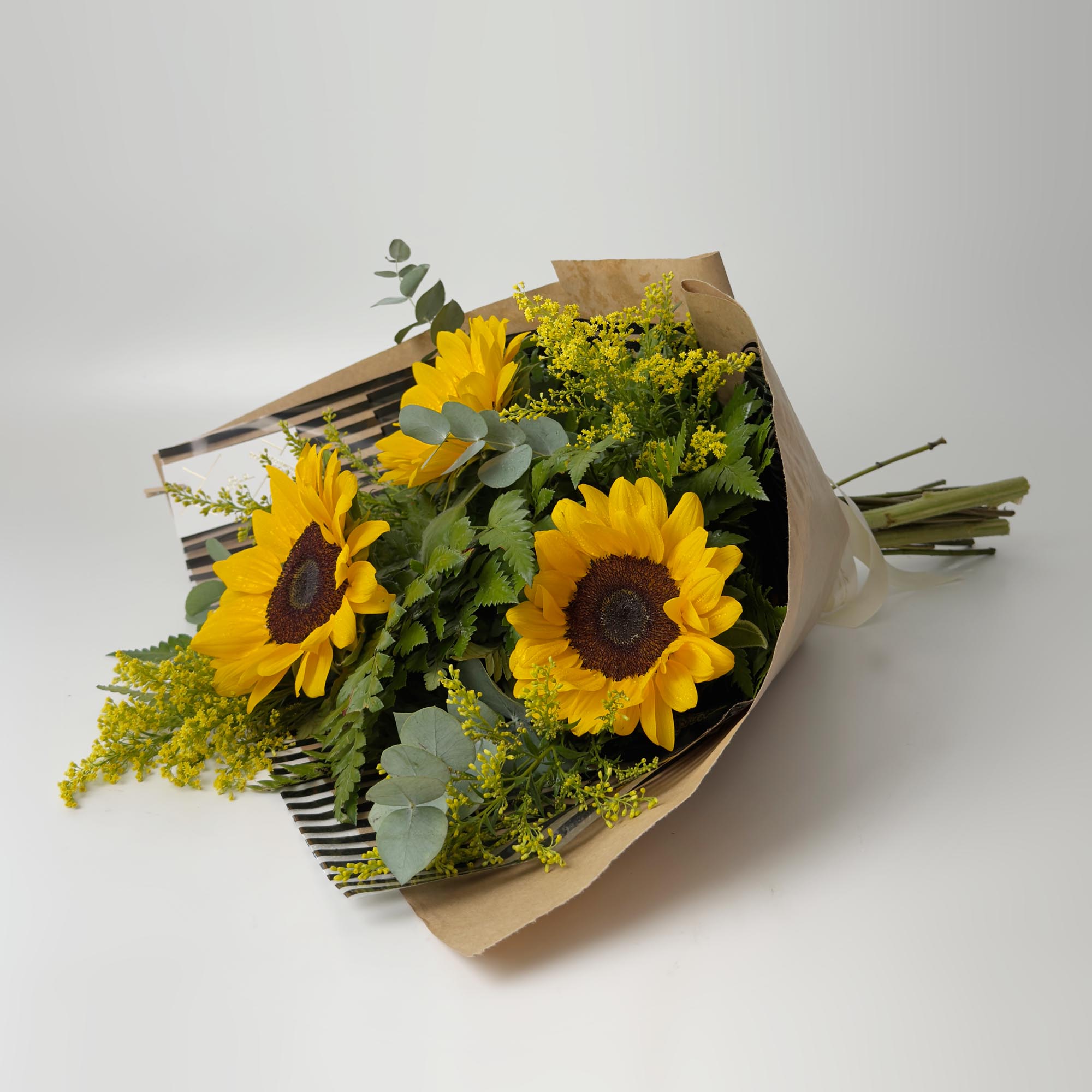 Deixe-se envolver pela beleza radiante do ramalhete com 3 girassóis